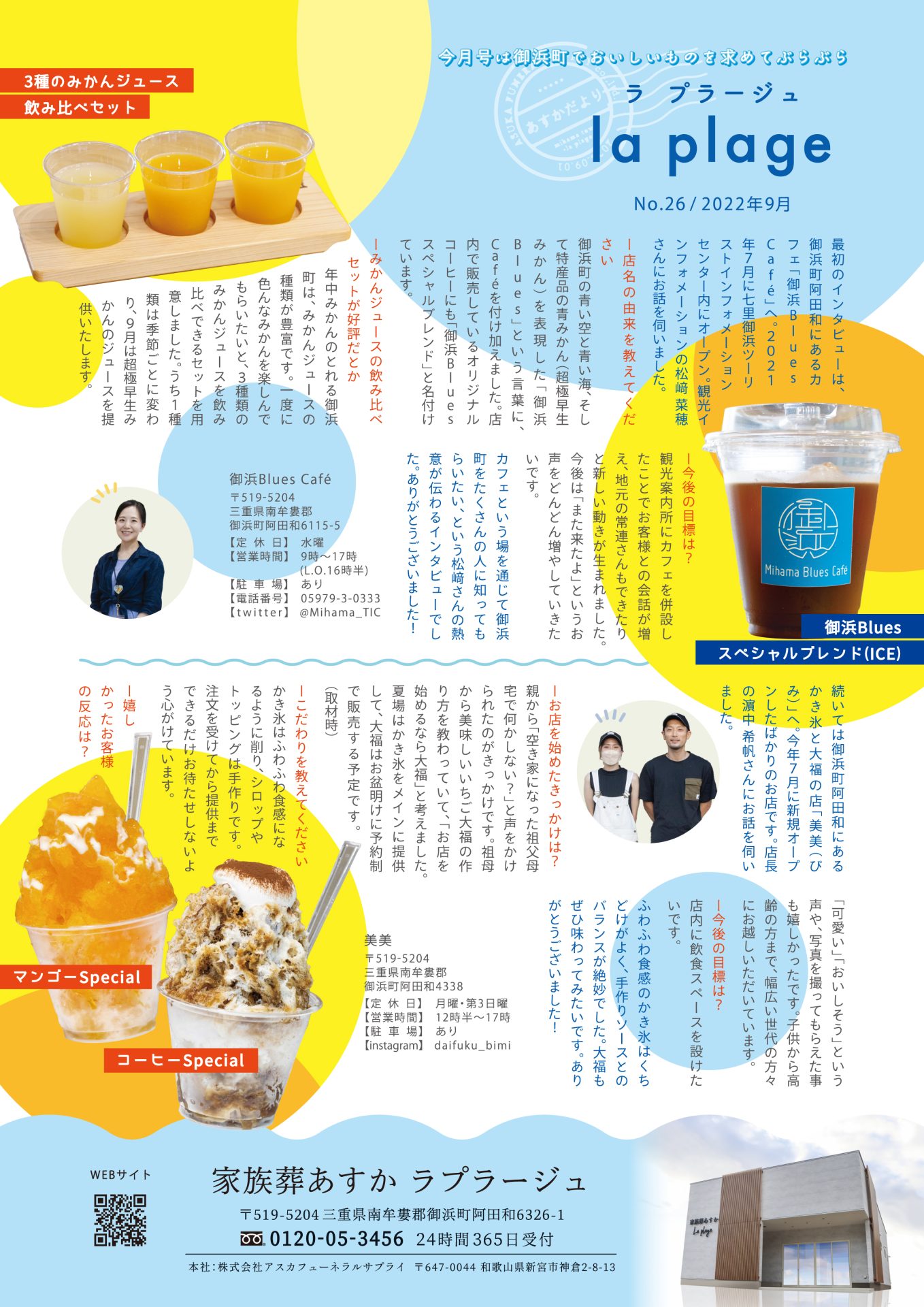 今回は、御浜町阿田和のカフェ「御浜Blues Café」さんと、かき氷と大福の店「美美(びみ)」さんにお話をうかがいました。