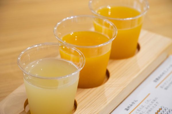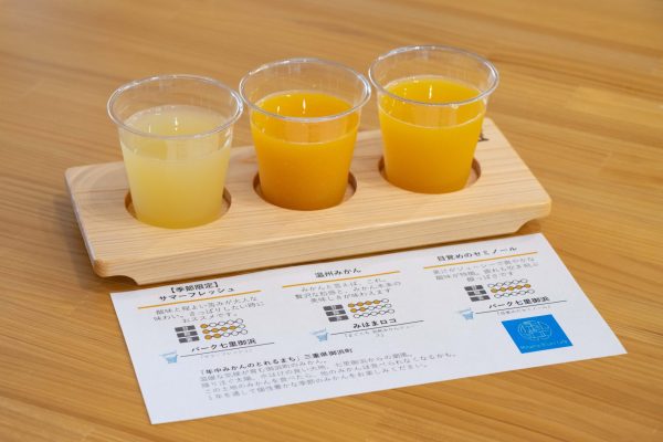 味や色など特徴の異なる御浜町の特産品 みかんジュースを3種類飲み比べできます。みかんジュースを販売しているお店も紹介されており、飲み比べセットを飲んだ後、「(みかんジュースを)買ったよ」と報告してくださるお客様もいらっしゃるとの事。