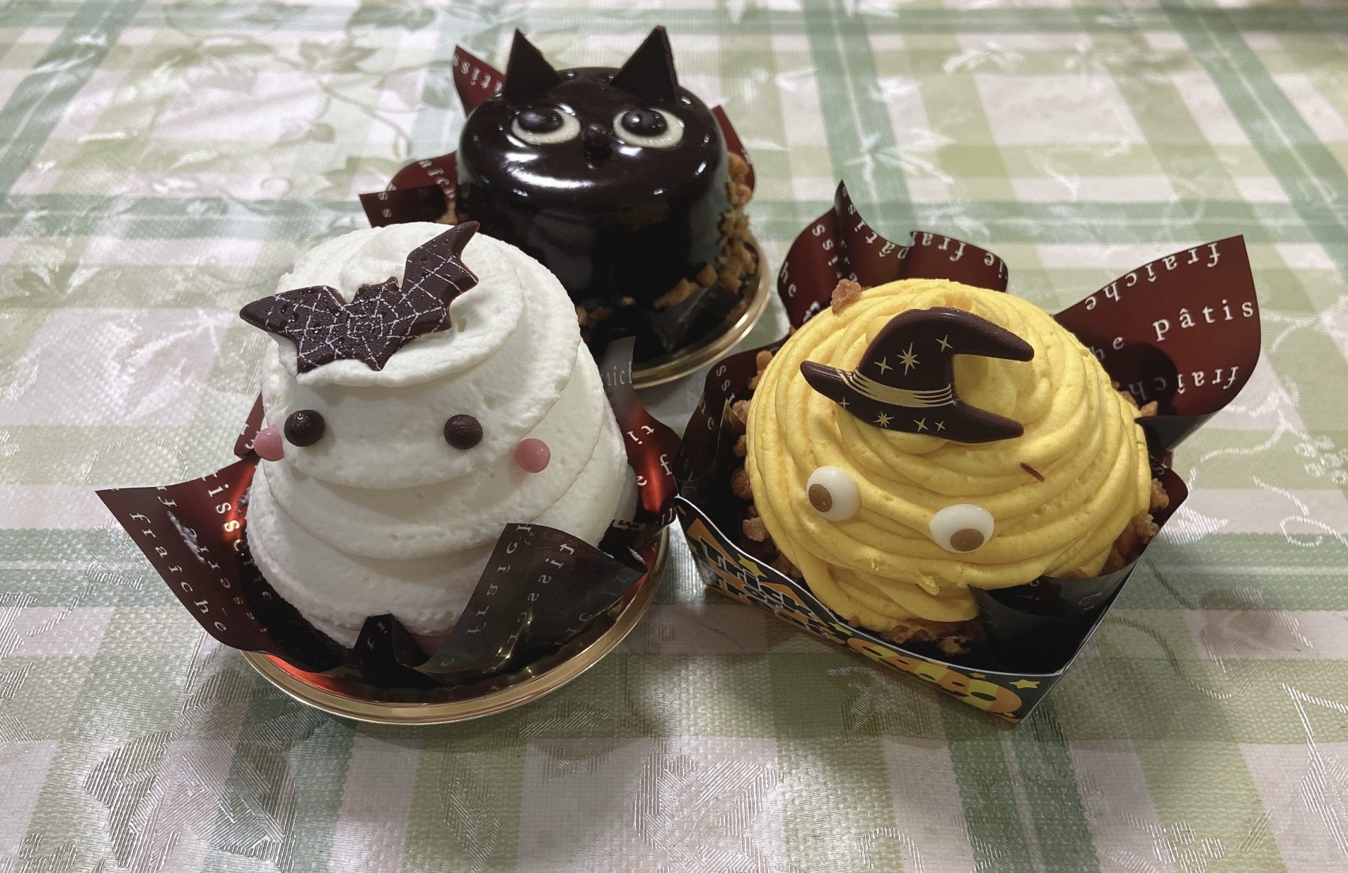 右からハロウィンいたずらゴースト、黒猫、おばケーキです。