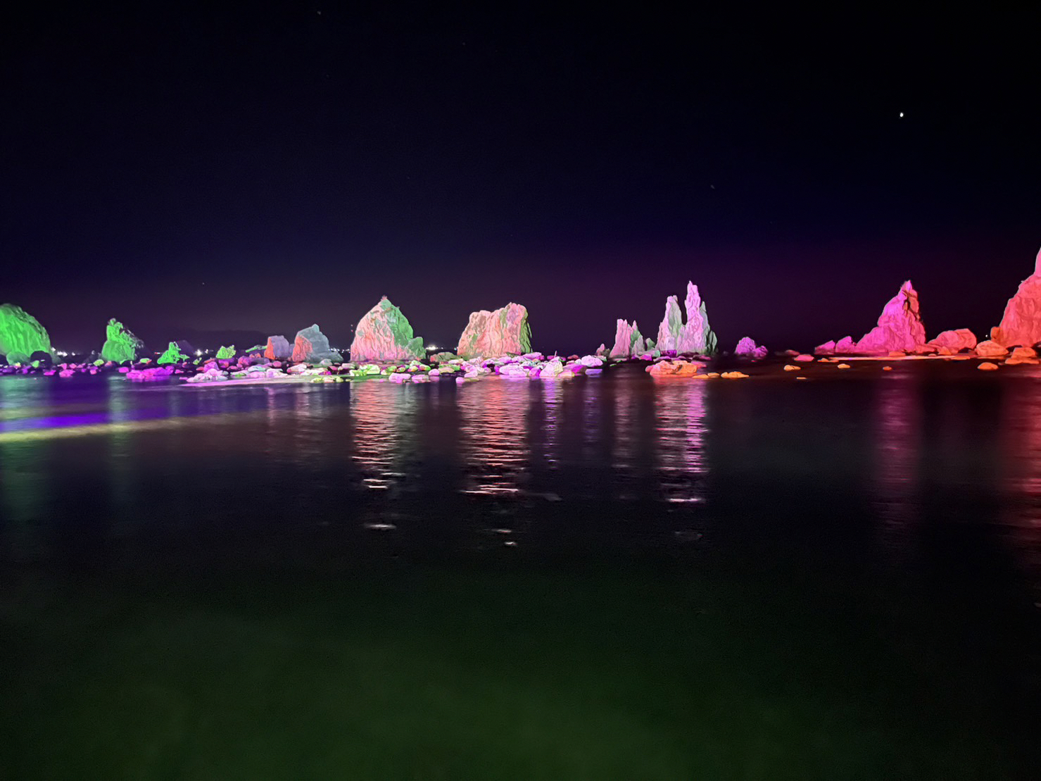 ライトアップされた夜の闇に浮かび上がる橋杭岩は