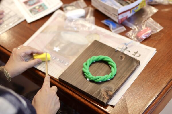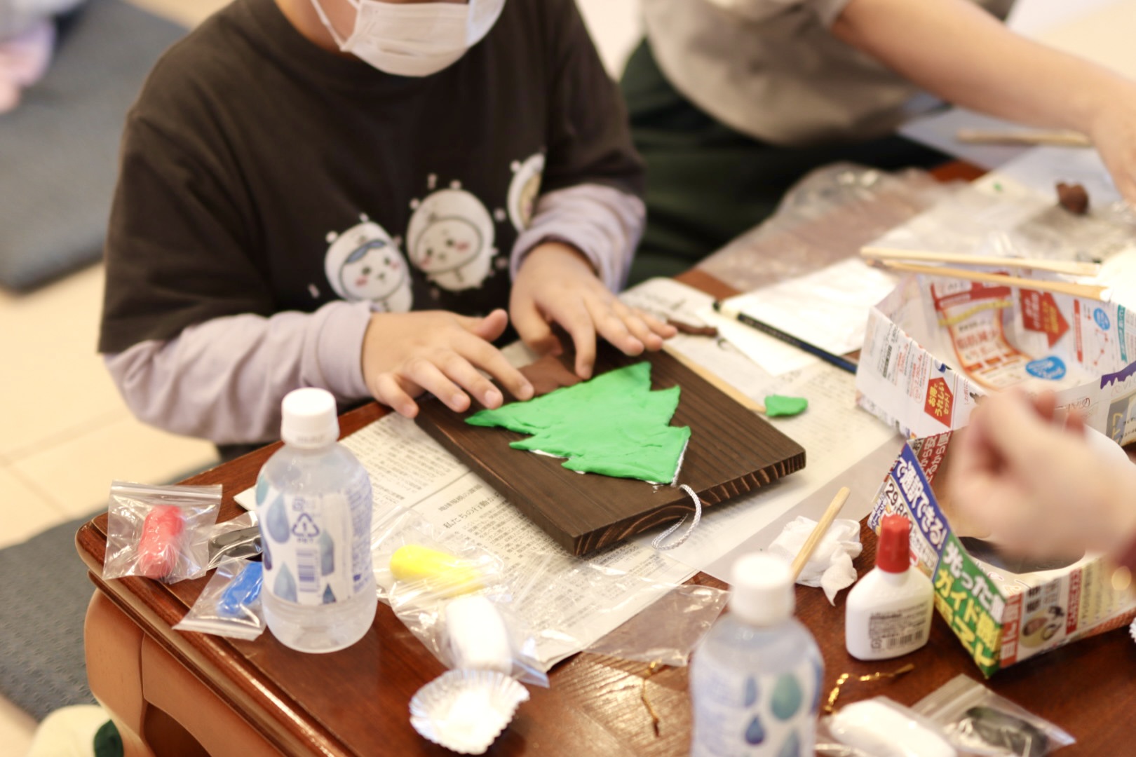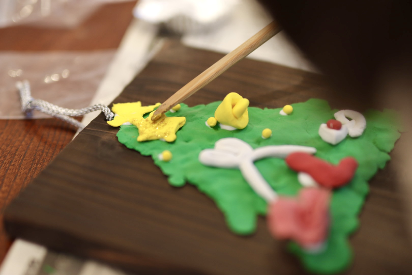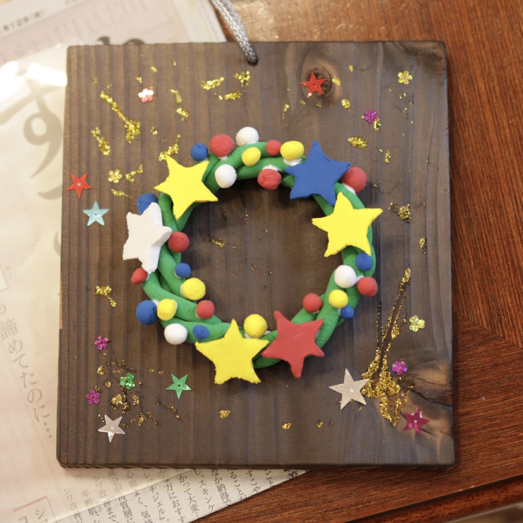 カラー粘土と杉板の表面を焼き焦がして炭化させた焼杉のキットが配布され、クリスマスツリー、リース作りがスタート♪