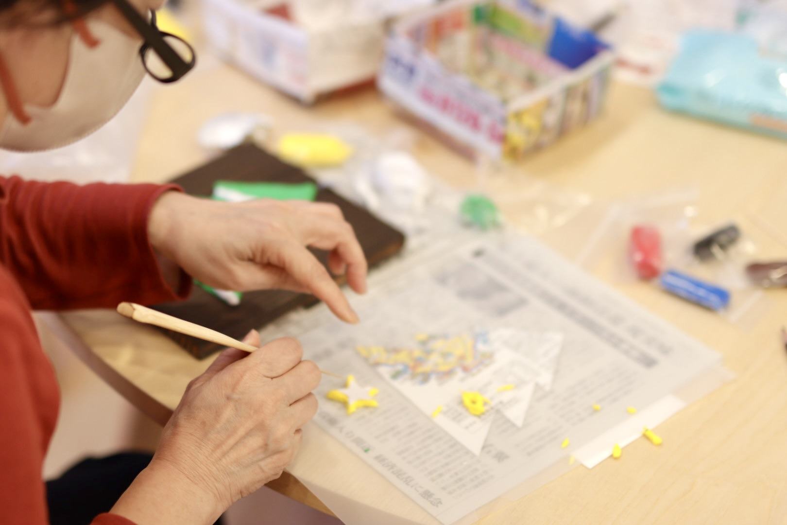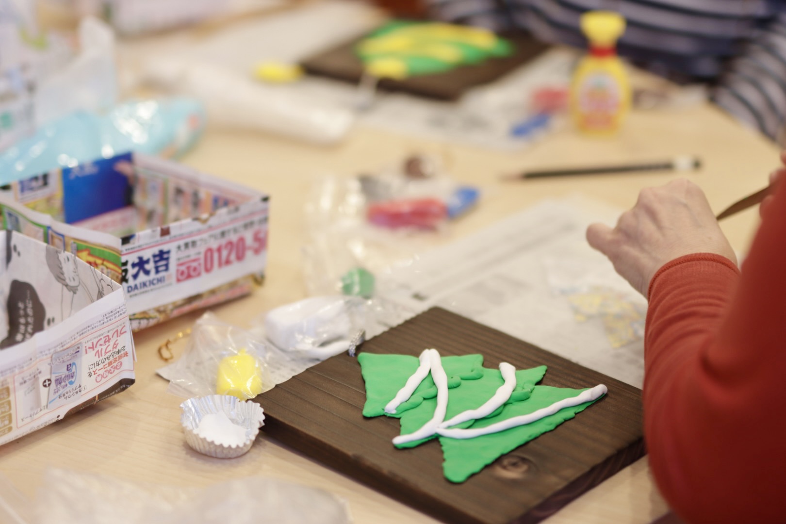 当日はお子さんも参加され、にぎやかな雰囲気の中、カラー粘土の緑色を使ってクリスマスツリーやリースを形作り、型抜きを使って靴下や星などの飾りを作り並べていきました。