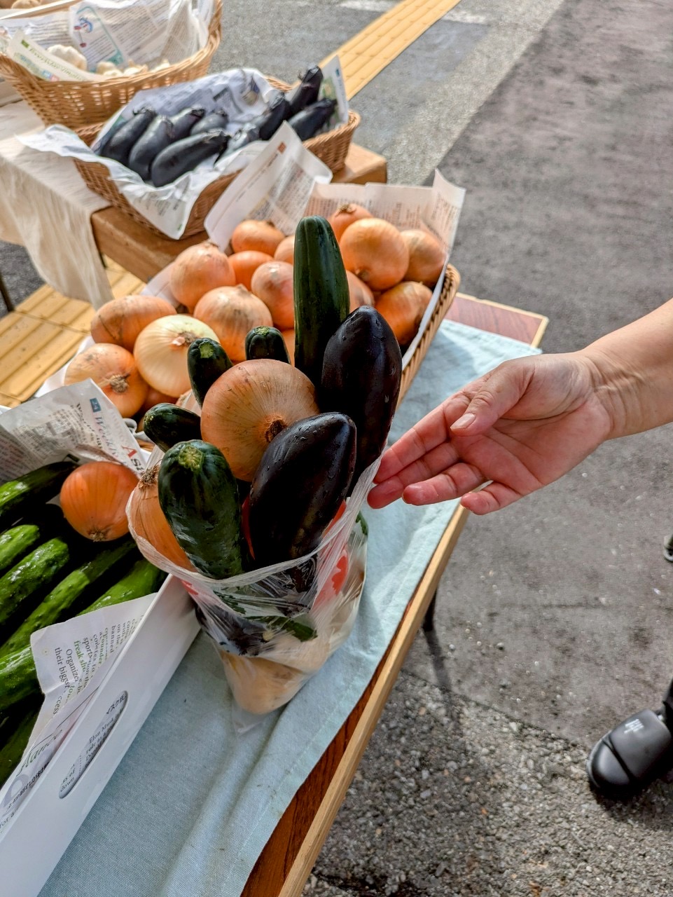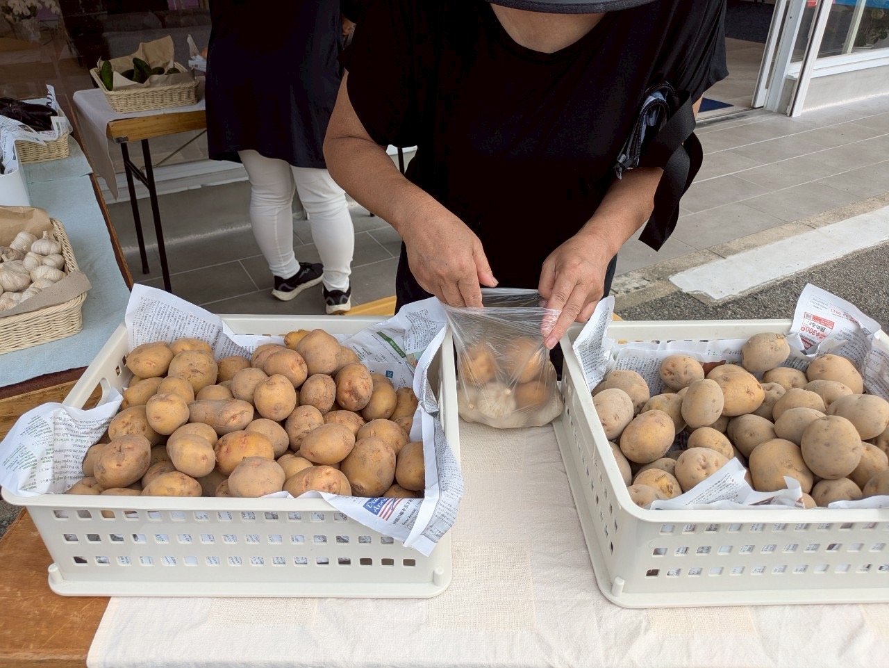 地元農家様にご協力をいただいて用意したじゃがいもや人参、玉ねぎやナスなどの野菜を、100円で袋に詰め放題のとってもお得な今回の企画🍅✨