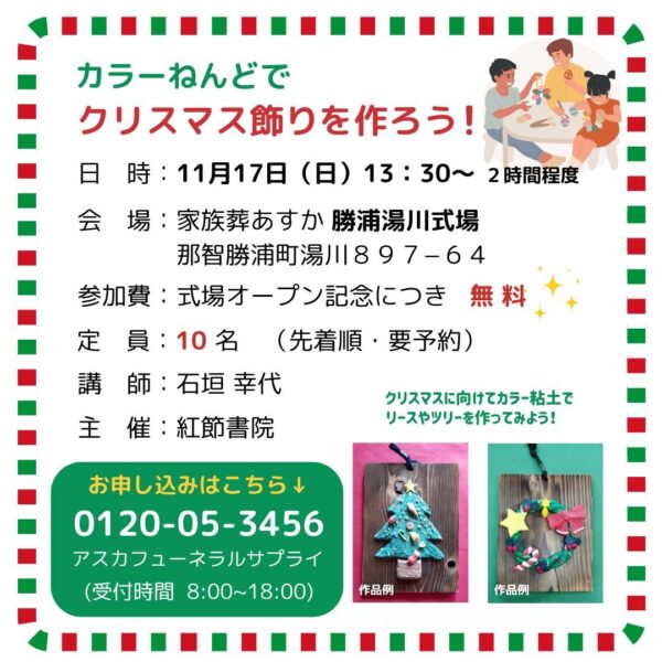 2024年11月17日(日)に、那智勝浦町湯川の弊社式場「家族葬あすか 勝浦湯川式場」にて、カラーねんどで作るクリスマス飾りのワークショップを開催いたします。