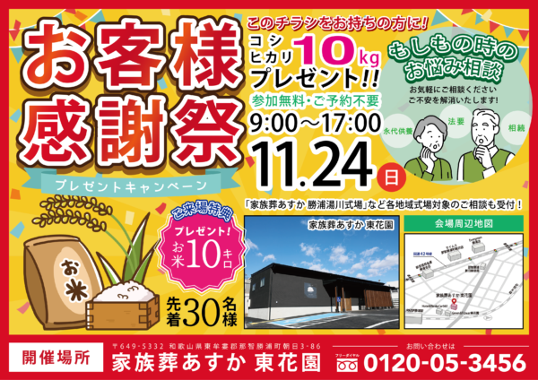 2024年11月24日(日)に、那智勝浦町朝日の家族葬あすか 東花園にて「お客様感謝祭」を開催いたします。