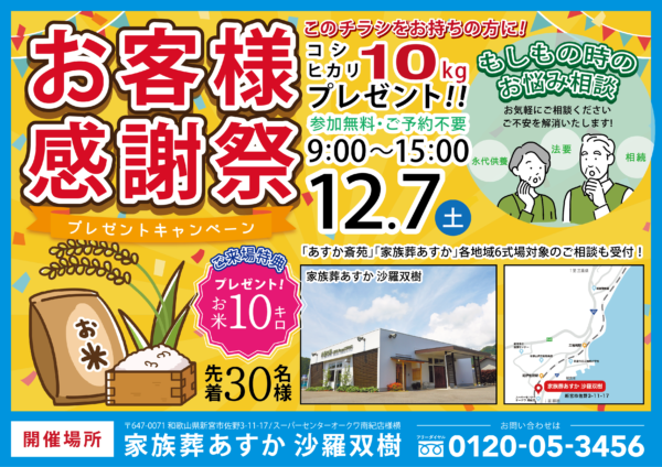2024年12月7日(土)に、新宮市佐野の家族葬あすか 沙羅双樹にて「お客様感謝祭」を開催いたします。