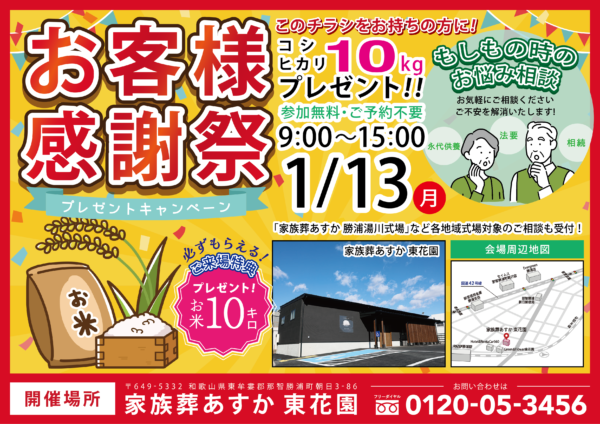 2025年1月13日(月)に、那智勝浦町朝日の家族葬あすか 東花園にて「お客様感謝祭」を開催いたします。