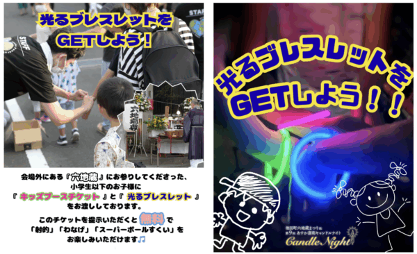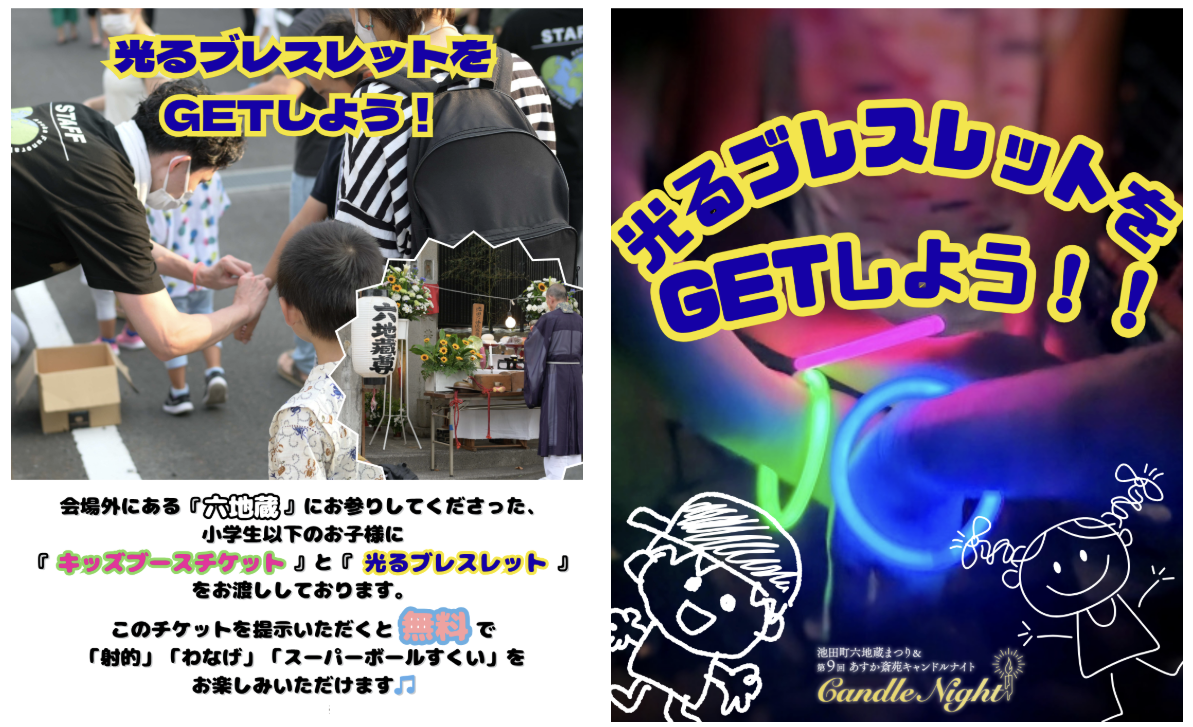キッズブースで遊べるチケットは、当日、六地蔵様にお参りいただいた後に光るブレスレットと一緒にお渡しいたします☺️チケットをキッズブースで提示いただくと、無料で「射的」「わなげ」「スーパーボールすくい」をお楽しみいただけます。