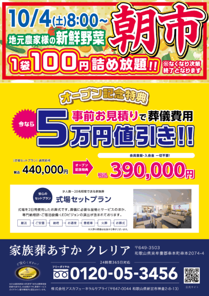 【串本町】10/4(土)朝市開催のお知らせ(家族葬あすか クレリア)