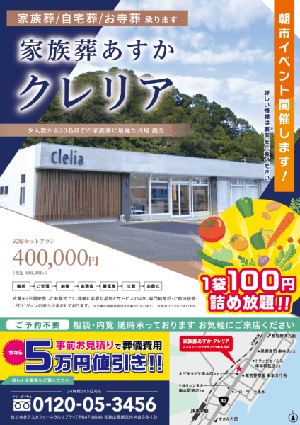 2025年10月4日(土)に串本町串本の「家族葬あすか クレリア」にて朝市を開催いたします。