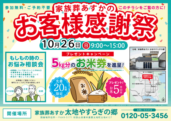 2025年10月26日(日)、家族葬式場「家族葬あすか 太地やすらぎの郷」にて「お客様感謝祭」を開催いたします。