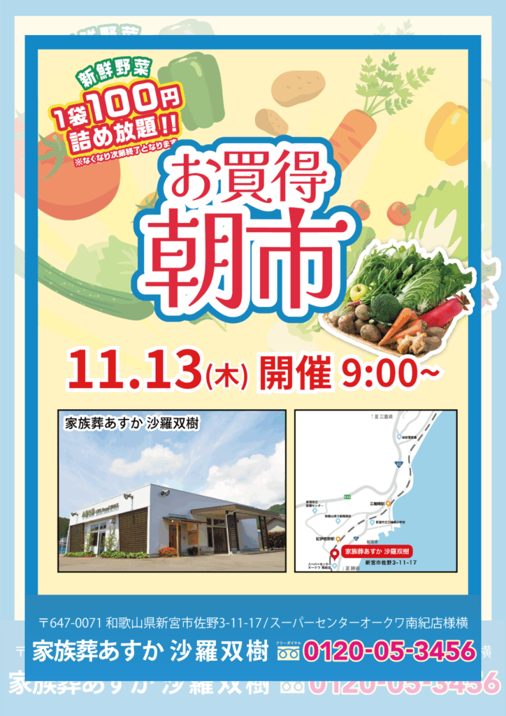 2025年11月13日(木)に和歌山県新宮市佐野の「家族葬あすか 沙羅双樹」にて朝市を開催いたします。