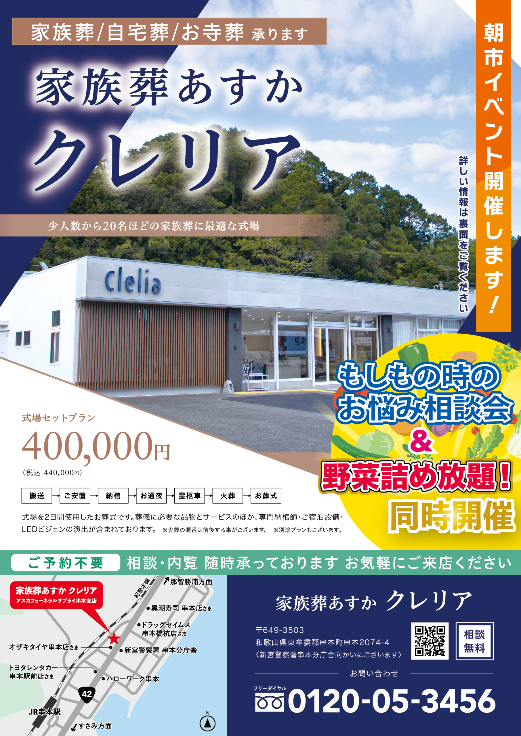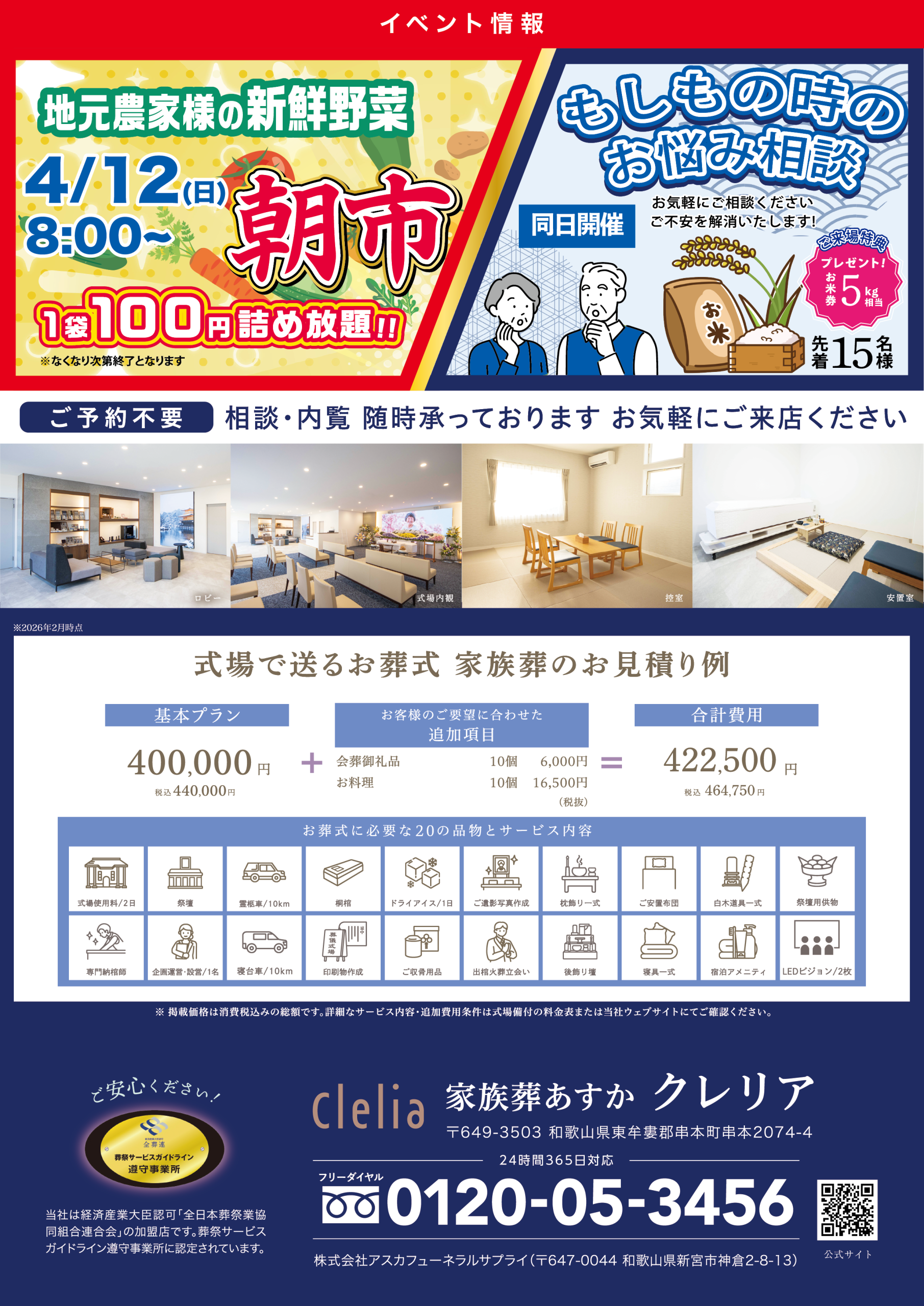 2026年4月12日(日)に串本町の「家族葬あすか クレリア」にて、もしもの時のお悩み相談会&朝市を開催いたします。