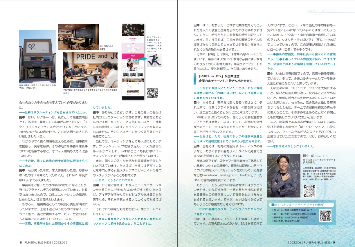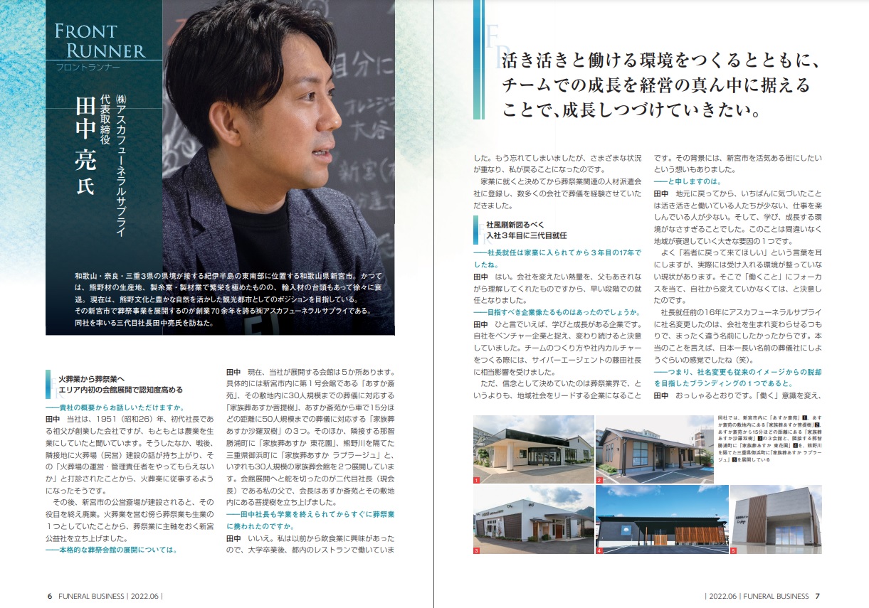 弊社の代表取締役 田中のインタビュー記事が、綜合ユニコム「月刊フューネラルビジネス*」2022年6月号に掲載されました。